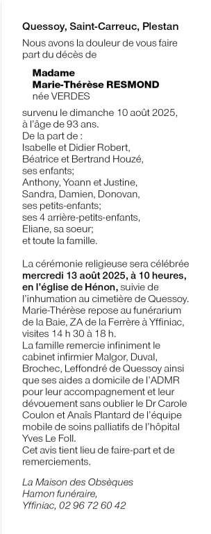 Décédée à Quessoy (22120, France) le dimanche 10 août 2025 à l'âge de 93 ans