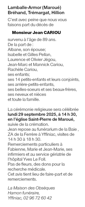 Décédé à Saint-Brieuc (22000, France) le jeudi 25 septembre 2025 à l'âge de 89 ans