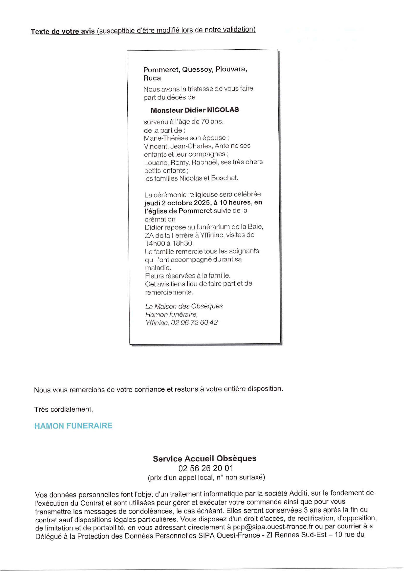 Décédé à Lamballe (22400, France) le dimanche 28 septembre 2025 à l'âge de 70 ans