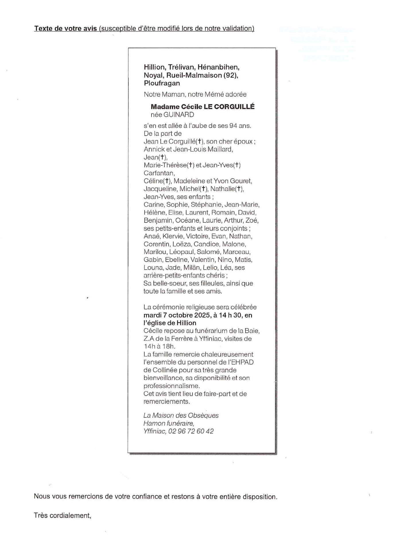 Madame Cécile LE CORGUILLÉ née GUINARD