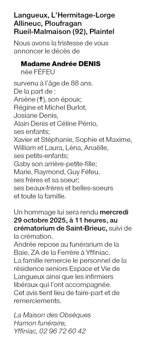 Décédée à Langueux (22360, France) le mercredi 22 octobre 2025 à l'âge de 88 ans