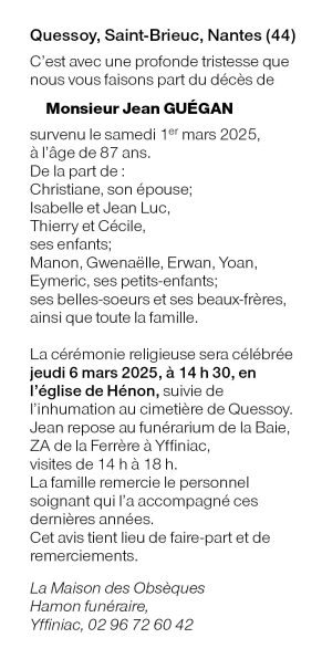 Décédé à Trémuson (22440, France) le samedi 1 mars 2025 à l'âge de 87 ans