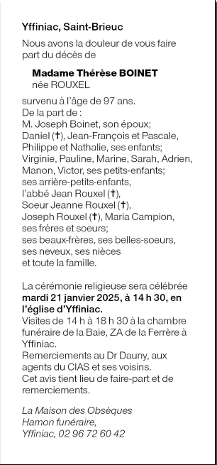 Décédée à Yffiniac (22120, France) le jeudi 16 janvier 2025 à l'âge de 97 ans