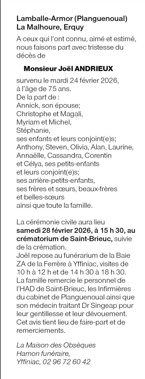 Décédé à La Cotentin Planguenoual (22400, France) le mardi 24 février 2026 à l'âge de 75 ans